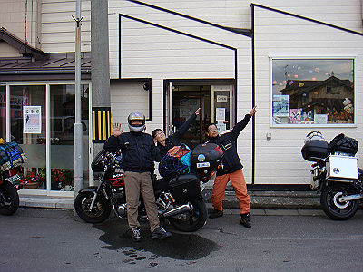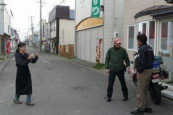 暫くすると、ここで待ち合わせのいちさん、nagaさんも無事に到着であります。 来るときのフェリーでどこへ行くの何のと色々情報交換してる中で、いちnagaコンビが3日目以降の予定がまったく決まってなくて、何とかしてくれ〜と泣き付いてきたんで、それでは天塩で落ち合おう、というコトになってたんですね。