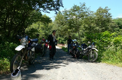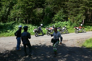 登り切った先にまだ坂が続くのを確認し、やっと鬼軍曹(復活おやじさん)から撤退の命がくだり、分岐まで戻って一服ですが、すでに汗みどろの熱中症一歩手前のボロボロ状態です。