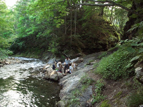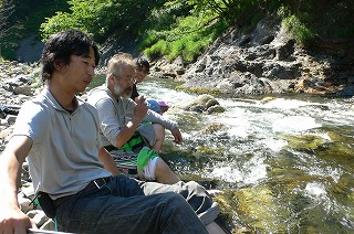 復活おやじさんと2人温泉に向かうと夫婦連れの先客がいたので戻ってくると、2人が川に足突っ込んで
