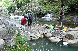 復活おやじさんが今日の晩飯用のニジマス釣りにとりかかりました。湯に浸かりながら奮闘振りを眺めていると、何とも贅沢な気分になってきますね〜