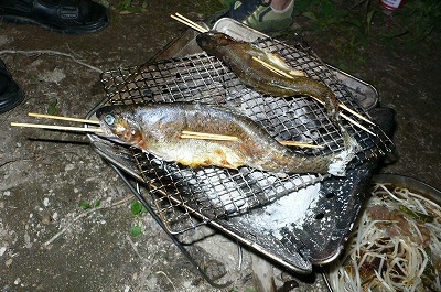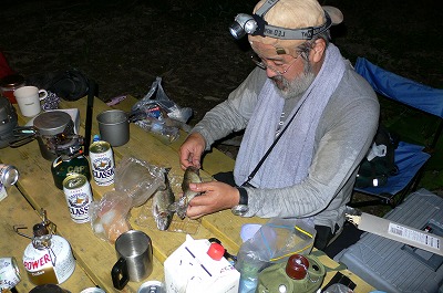 テン場に戻って、復活おやじさん早速虹鱒の塩焼きの仕込み作業であります。
