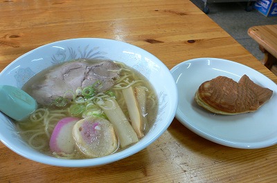 頼んだ塩ラーメンはあっさり系で、期待してなかった割にはなかなかで、タイヤキの注文はもちろんハムタイ。