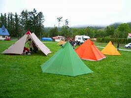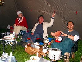 日暮れと共に、巨大参天パビリオンの中で総勢11名の宴会開始です。