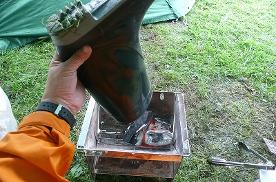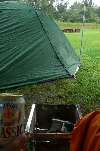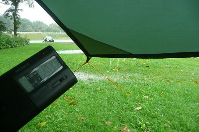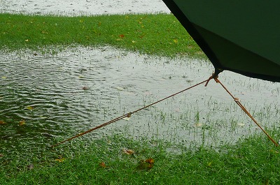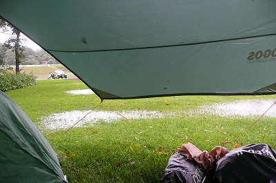 昨夜からの雨で、窪地に雨水の池が出来始めてきました。 ふ〜、テント設営場所高いトコロにしといて良かった・・・